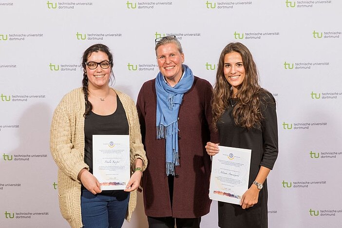 Die Lehramtsstudentin Paula Kasper (li) und Journalistik-Studentin Mona Ameziane (re) sind die Trägerinnen des Angelika-Möller-Preises, der an der TU Dortmund verliehen wird.Paula Kasper erhielt den Preis bereits zum zweiten Mal für herausragende Leistungen im Studiengang Lehramt Primarstufe; Mona Ameziane erhilt ihn 2017 für herausragende Leistungen im Fach Journalistik an der kulturwissenschaftlichen Fakultät. Übergeben wurde er von Gela Mund vom Hilfsfonds SI Dortmund Hellweg.